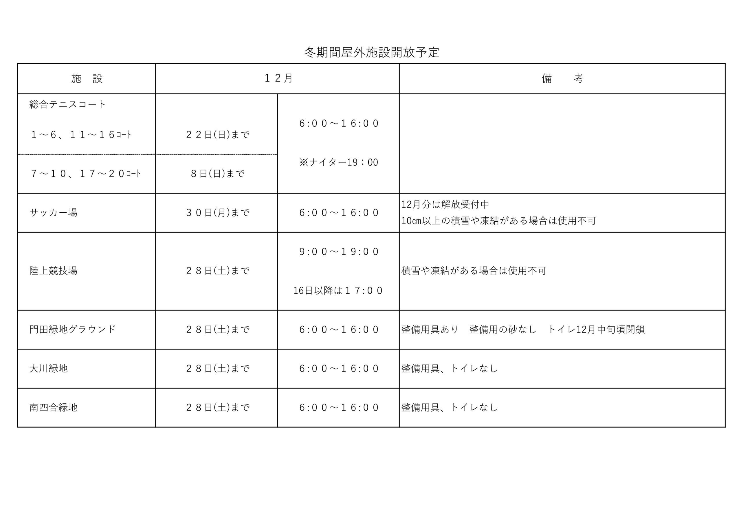 冬期間の屋外施設開放予定(12月分)についてお知らせいたします。