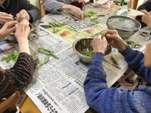 利用者様には、カレーのトッピング用のスナップエンドウの実を取りだす作業のお手伝いをして頂きました!