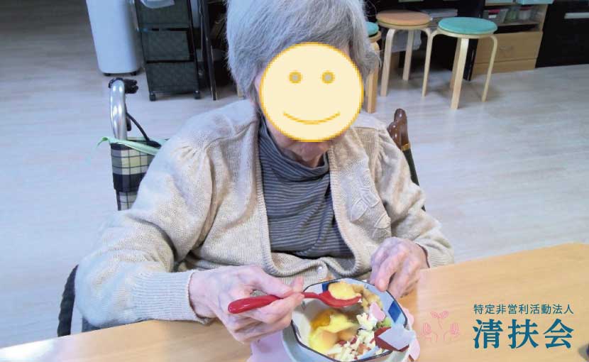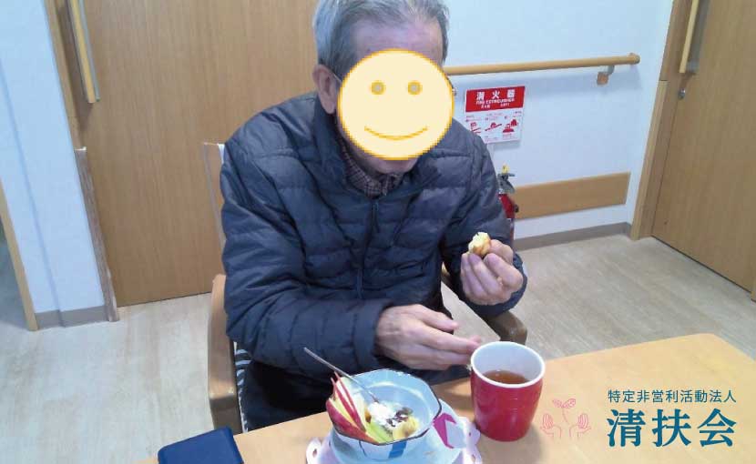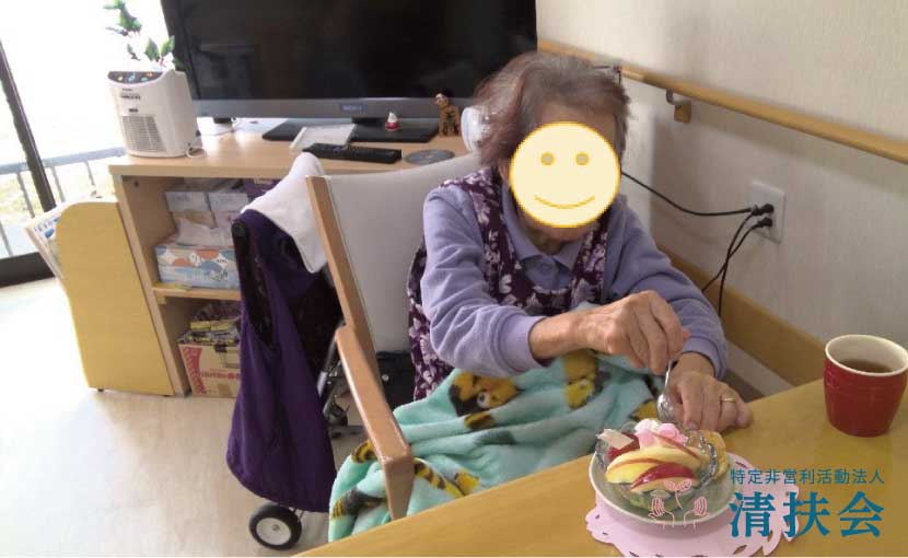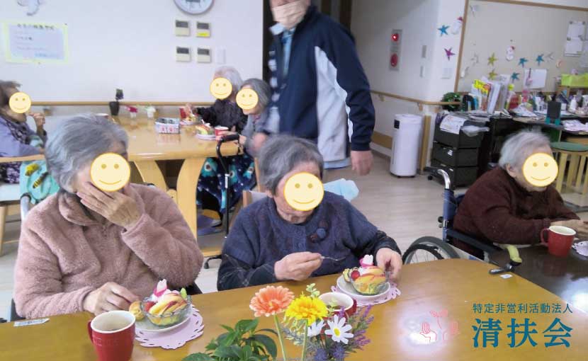 利用者様に喜んでいただければと、プリンアラモードに手作りのカステラを添えた特別なおやつを皆様と楽しみました。
